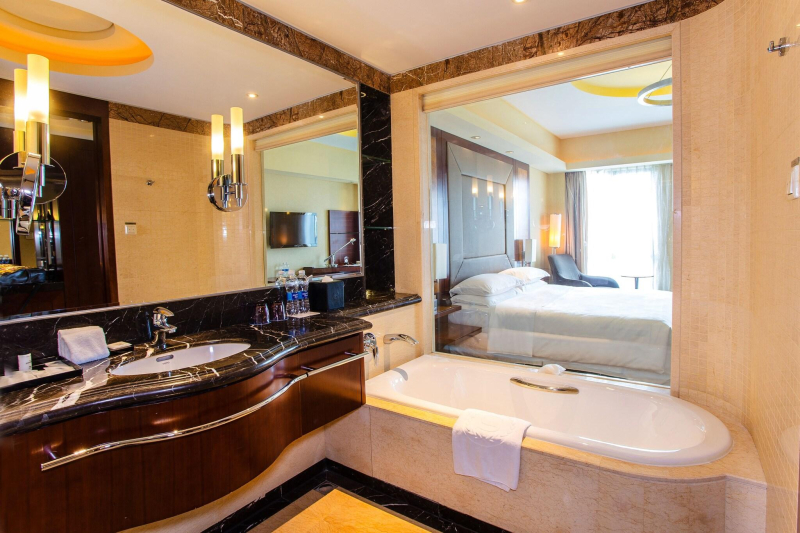 A stay at Sheraton Wenzhou Hotel places you in the heart of Wenzhou, within a 5-minute drive of Wenzhou Sports Center and Bailuzhou Park. This luxury hotel is 0. 4 mi (0. 6 km) from Wenzhou Exhibition Hall and 1. 2 mi (1. 9 km) from Wenzhou Maanchi Park. . Take time to pamper yourself with a visit to the full-service spa. If you're looking for recreational opportunities, you'll find a 24-hour health club and an indoor pool. This hotel also features complimentary wireless internet access, concierge services, and gift shops/newsstands. . Make yourself at home in one of the 303 air-conditioned rooms featuring refrigerators and LCD televisions. Cable programming and DVD players are provided for your entertainment, while complimentary wireless internet access keeps you connected. Private bathrooms with separate bathtubs and showers feature designer toiletries and hair dryers. Conveniences include phones, as well as safes and desks. . Grab a bite at Feast, one of the hotel's 2 restaurants, or stay in and take advantage of the 24-hour room service. Wrap up your day with a drink at the bar/lounge. Buffet breakfasts are available daily from 6:30 AM to 10:30 AM for a fee. . Featured amenities include a 24-hour business center, complimentary newspapers in the lobby, and dry cleaning/laundry services. Event facilities at this hotel consist of conference space and meeting rooms. Free self parking is available onsite. . Distances are displayed to the nearest 0. 1 mile and kilometer.