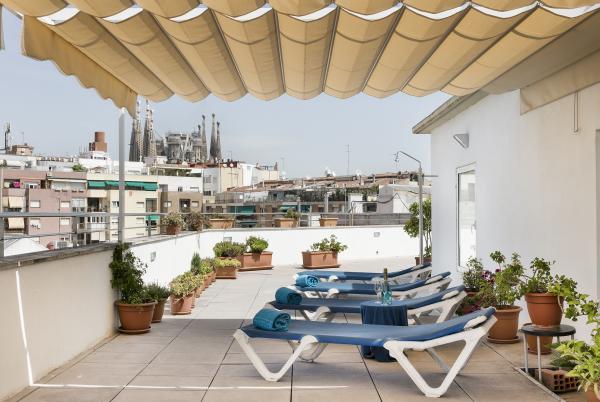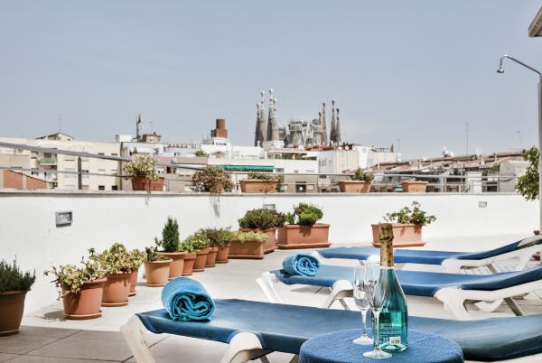 This cosy, elegant hotel is conveniently located in the Eixample district, ideal to explore the city on foot. It offers a rooftop terrace with views to the world-famous Sagrada Familia cathedral, which is just a few steps away. Other attractions such as Passeig de Gracia, Gaudis Casa Batllo, Arc de Triomf, Placa de Catalunya, Las Ramblas or the old town Barri Gotic can be reached within a short stroll.