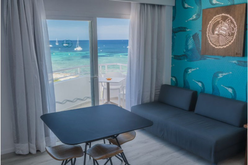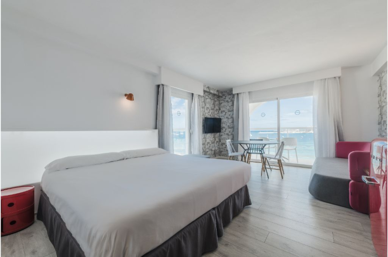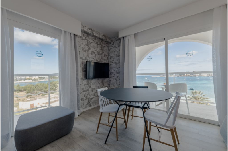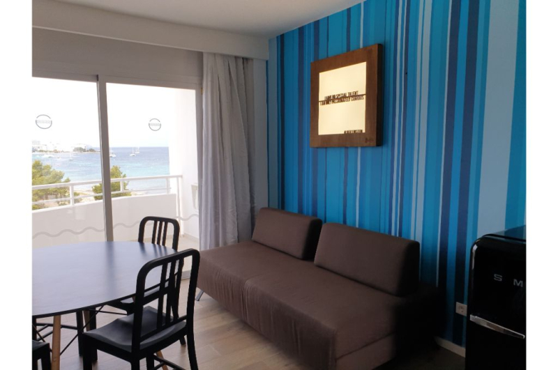 Located on Playa des Pouet, in the Bay of San Antonio, one of the most important tourist and commercial centers in Ibiza. Our studios have been recently modernized and offer you all the comforts to make your stay as comfortable as possible: air conditioning, heating, kitchenette with fridge and microwave, full bathroom and terrace with full or partial sea view. The entire ground floor of the establishment: solarium, swimming pool and cafeteria, has free Wi-fi Internet service for customers. The La Kiki Apartments offer you the possibility of enjoying the beach just by walking 30 meters, or if you prefer, take advantage of the solarium with swimming pool without leaving the establishment or enjoy the La Kiki Cafe. As evening falls, you should not miss one of the most famous attractions on the island. The sunsets that are contemplated from the La Kiki Apartments, make visitors and residents of Ibiza, move to this area daily to enjoy the show. You can enjoy the international cuisine of La Kiki Cafe, which in addition to wonderful views. You can also choose to take a walk along the recently inaugurated promenade that borders the bay. Balearic tourist tax is not included in the total price and it must be paid the day of arrival (check in) in the establishment.