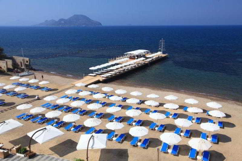 This elegantly designed complex offers stylish accommodation right on the beach at Turgutreis with stunning views of the island of Kos and other small islands in the Aegean Sea. The suite hotel features a range of facilities including a spa, indoor pool and an attractive outdoor complex with pools, private beach and wooden jetty. Changing cabins are available by the pools and beach. The centre of Turgutreis is a 5-minute car ride away and the cosmopolitan resort of Bodrum is at 20 km. Closer to the complex is the pretty fishing village of Gumusluk, less than 10 minutes away by car.